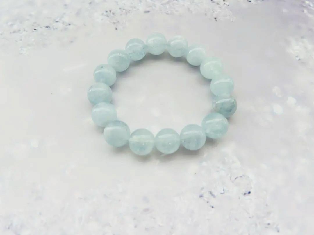 このブレスレットはアクアマリンで作られており、透明感のある淡い水色が特徴です。アクアマリンは、心を落ち着ける効果があるとされ、多くの人に愛されています。