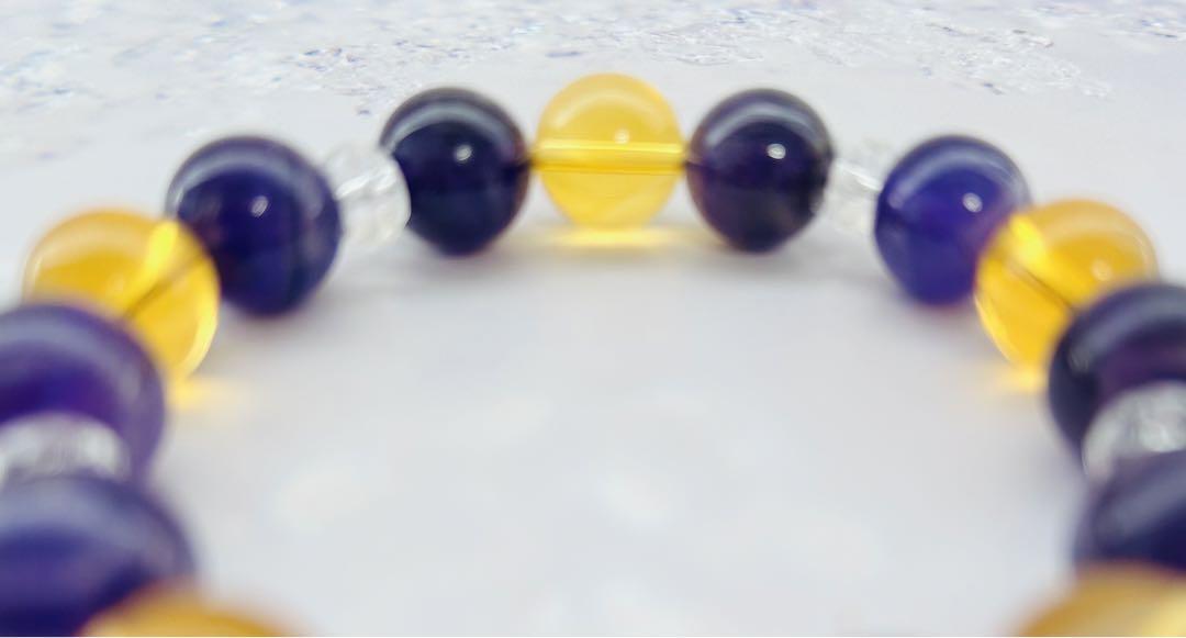 紫、黄色の天然石を使用した美しい色合いのブレスレットです。透明なクリスタルビーズがアクセントとなり、全体のデザインを引き立てています。